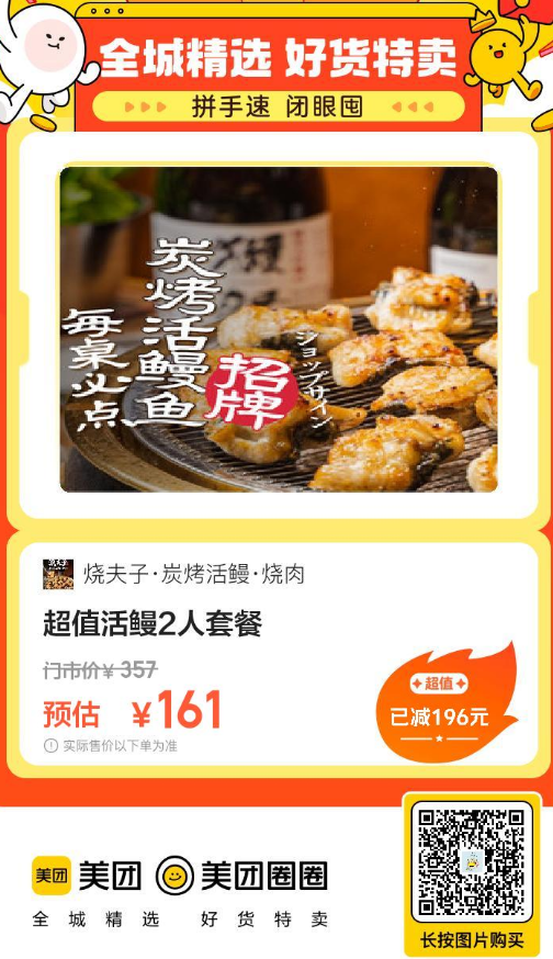 烧夫子·炭烤活鳗|超值活鳗2人套餐产品 / 2023-08-04 相关文章: 【14个城市通用&轻喜到家】仅129元即享受门市价399元家庭保洁单次体验券,4个小时服务+全屋7区120个保洁标准! 喷一喷5分钟熟睡,仅49元抢3瓶卡罗圣蜜薰衣草睡眠喷雾!先进萃取技术,拯救失眠 仅29.8元抢红心番石榴~净果约5斤~果味清香,果肉细腻~包邮到家~ 北京环球影城单日门票373.4元起 人均¥100+住进「长泰山外悦居度假别墅」双卧洋房 团购顺席粤式·红酒杯·砂锅料理·露台餐厅128元双人餐 特惠抢购 宴江南尚品餐厅99元招牌3-4人餐 湘粤王府宴·湘粤|200元代300元券 烧肉酒場勇助|超值· 2-3 人套餐 霸腹烤肉|47.5元代50元券